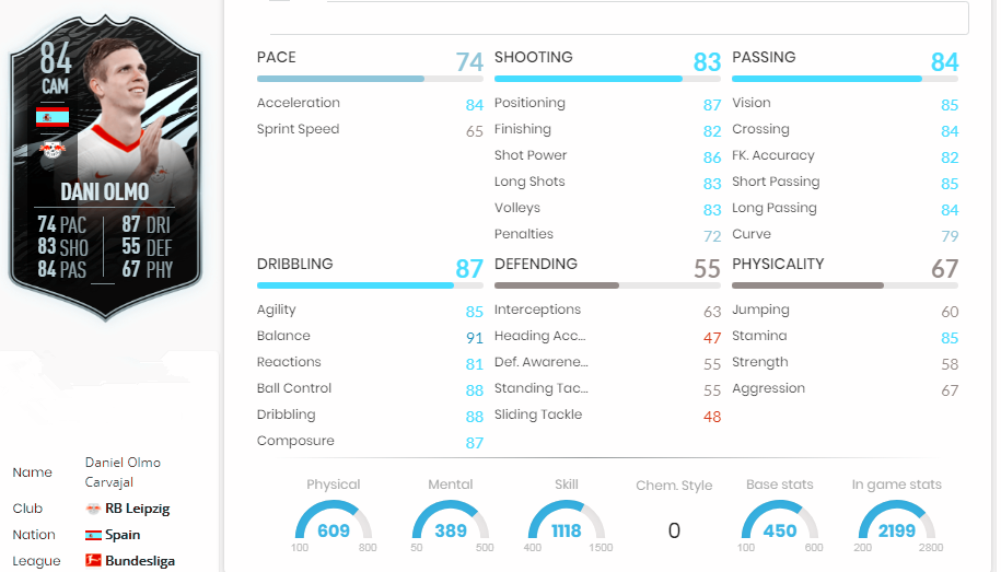 If you're looking for a strong option to bolster your FUT 21 Ultimate Team, unlocking TOTS Moments Dani Olmo isn't a bad idea. This 91 OVR rated center attacking midfielder has a 94 in Pace and Dribbling, a 90 in Passing, and an 88 in Shooting. Underneath, he's boasting a 99 in Balance, 99 in Acceleration, and 90+ ratings in Agility, Ball Control, Dribbling, Composure, Positioning, Shot Power, Vision, Crossing, Short Passing, Long Passing, and Stamina.