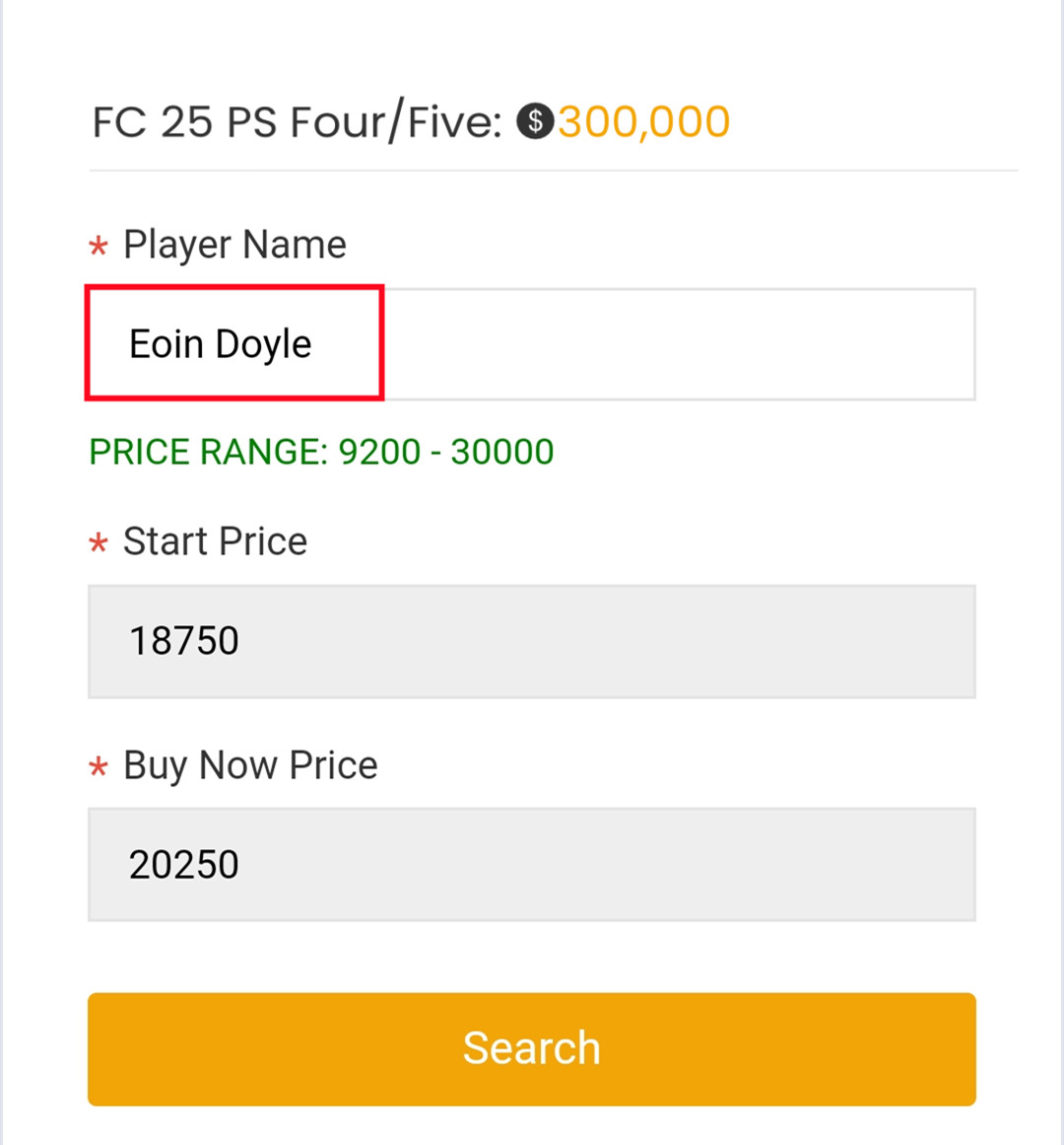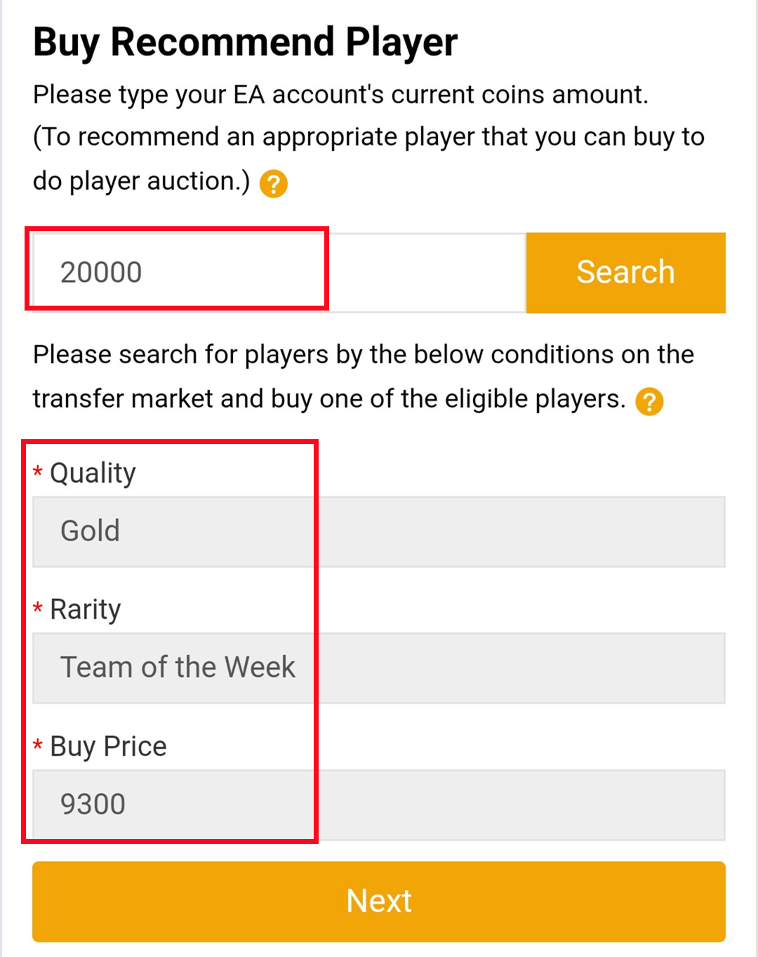 6. Scorri in basso, inserisci la quantità di monete attuale del tuo account EA, clicca "Cerca" e ottieni la condizione di ricerca. Il sistema consiglierà il giocatore che puoi comprare sul mercato in base alle tue monete di gioco. Più monete hai, più grande sarà la carta e più veloce sarà il trasferimento.