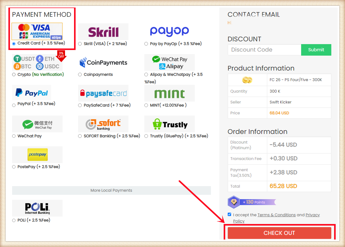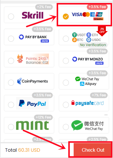 3. Choose the payment method and proceed to CHECK OUT.