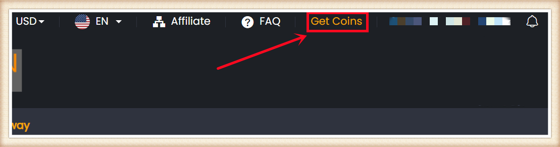 4. Click "Get Coins" at the top right, find your order, and click "Get Coins".