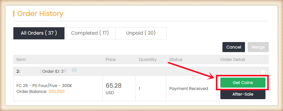 4. Turn to "GET COINS" at bottom of the page, find your order, and click "Get Coins".