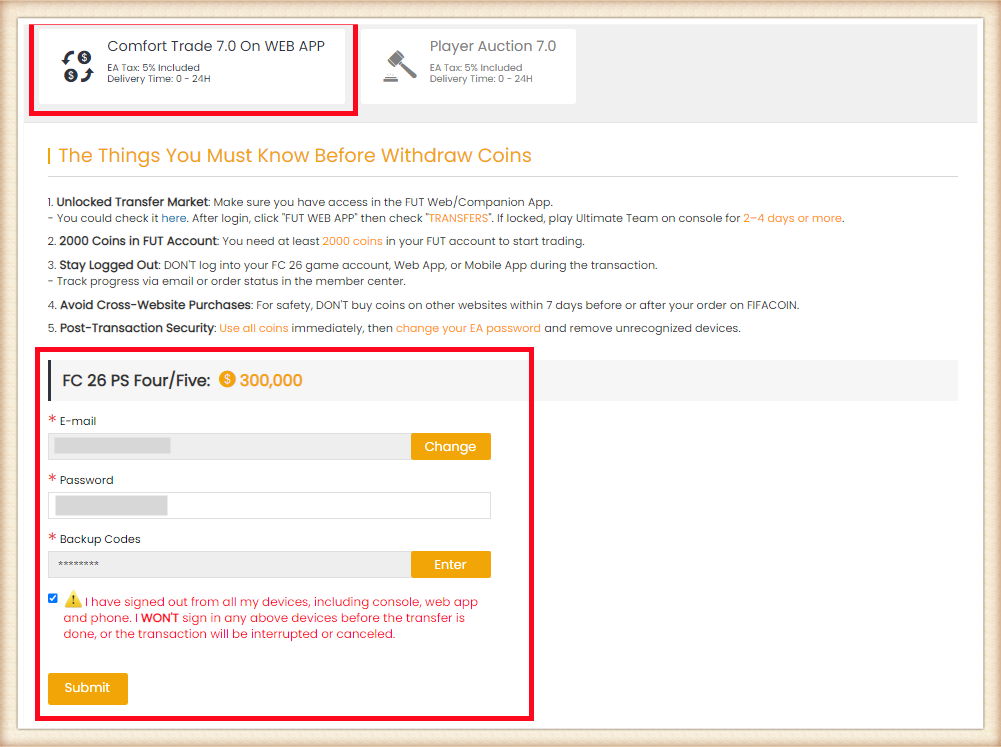 • Stay Logged Out: Do not log into your FC 26 game account, Web App and Mobile App to prevent any interruptions during the transaction.