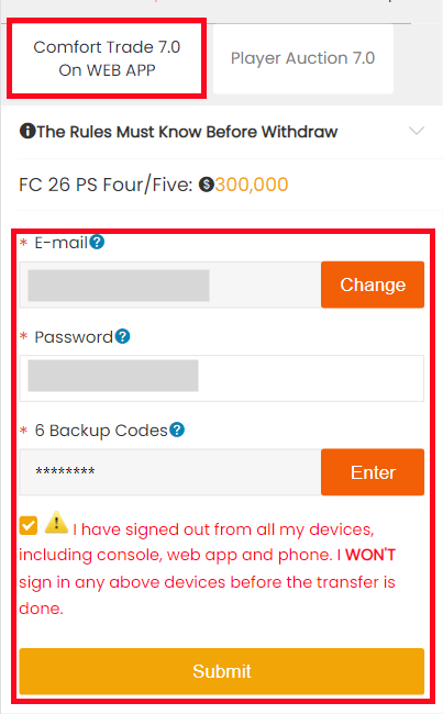 5. Choose "Comfort Trade 7.0 On WEB APP" transfer method. Type your correct EA account information below, then click "Submit". It will take minutes to verify your account, please wait patiently.