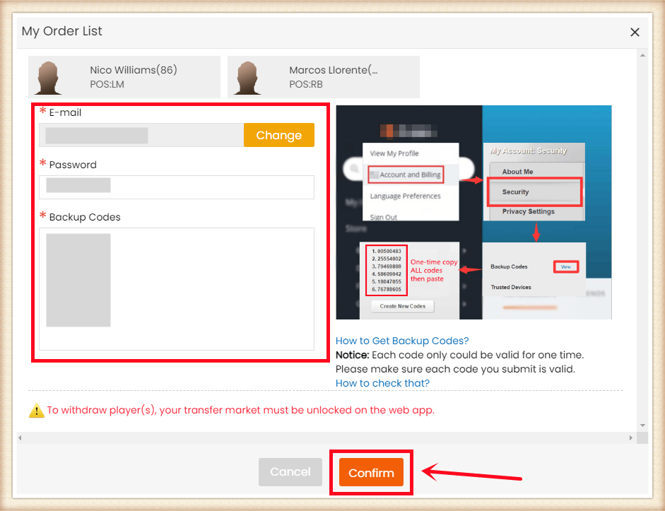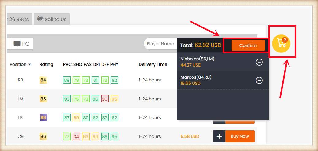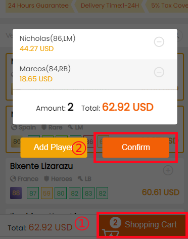 3. Click the Shopping Cart right side of the page. Double-check all the players you want to buy, then click "Confirm".