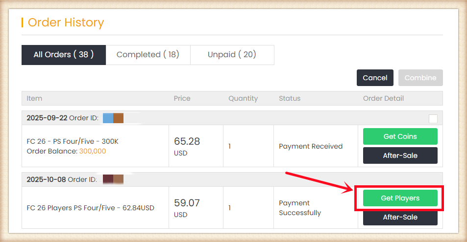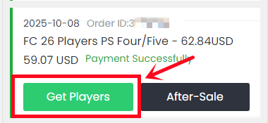 5. After paying successfully, please go to "ME - My Orders - Order History", find the order you just paid for then click "Get Players".