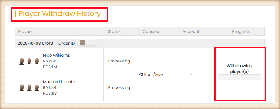 7. After a player was bought, you can go to Member Center - Orders - Player Withdraw History to check.