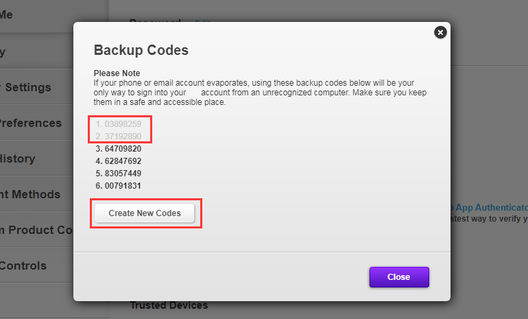 Avviso: i codici di backup sono grigi significa che sono già stati utilizzati poiché ogni codice potrebbe essere valido solo per una volta.